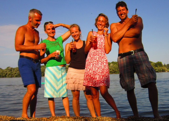 Donaustrand bei Budapest: Nachmittag mit Bastian, Eva, Virginie, Rita, Alex und Aperol Spritz. 12. August 2014